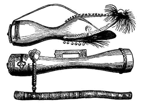 Two drums (top and middle) and a tobacco pipe (bottom). The home-grown tobacco was stuffed into the top of the smaller pipe and set alight. The tobacco smoke was then sucked down into the larger pipe and inhaled. Many of the items that the Isabella sailors traded in the strait had actually come from the coast of Papua New Guinea. The islanders were part of a trading network that had probably existed for thousands of years. They also traded with the natives of mainland Australia and occasionally with Indonesian trading praus.