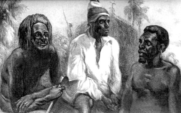 Old Duppa (left), Mamoose (centre) and Seewai (right) at Erub. Duppa’s oldest son, also Duppa, married an Erub girl and went to live at Treacherous Bay, where he established cordial relationships with visiting crews. His parents became regular visitors and were staying with their son and his new wife when this portrait was drawn.