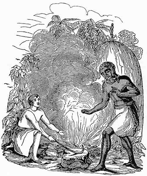 Illustration from The Shipwrecked Orphans depicting John teaching Duppa to bend iron with fire. The modest dressing is at least an acknowledgement that it is a children’s book. Page 50. Caption: The kind Murray Islander surprised and delighted at perceiving iron can be bent by fire.