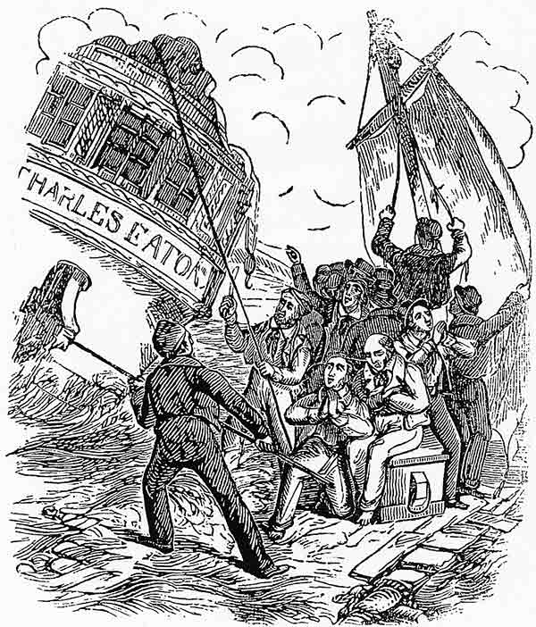 The Shipwrecked Orphans: A true narrative of four years suffering. Edited by Thomas Tellar, New Haven, S. Babcock, 1845. Published July 2, 2012 at 600 × 702 in Part Three: their fate is so horrible The unhappy crew climb aboard the raft and bed adieu to the wreck of the Charles Eaton. Share this:Share Email a link to a friend (Opens in new window) Email Tweet Print (Opens in new window) Print