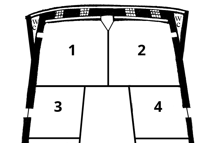 Advertised for sale soon after her arrival in London, she was described in the Guardian and Public Ledger (6 Sept. 1833) as having: “two flush decks, forecastle, bust head and quarter galleries, and is coppered to the wales in chunam [lime plaster] and felt”, the latter two being a common base for the copper sheathing of hulls. Her most attractive feature for first-class passengers was two quarter galleries, common on the large merchant ships servicing the Honourable East India Company (HEIC), but much less so on small merchant vessels the size of the Charles Eaton. Externally, they added extra decorative touches to the sides of the ship’s stern; internally they were usually tiny windowed WCs (water closets) with their toilet holes projected out over the sea. They were an extra luxury and could only be used by the occupants of the two largest poop cabins at the stern.