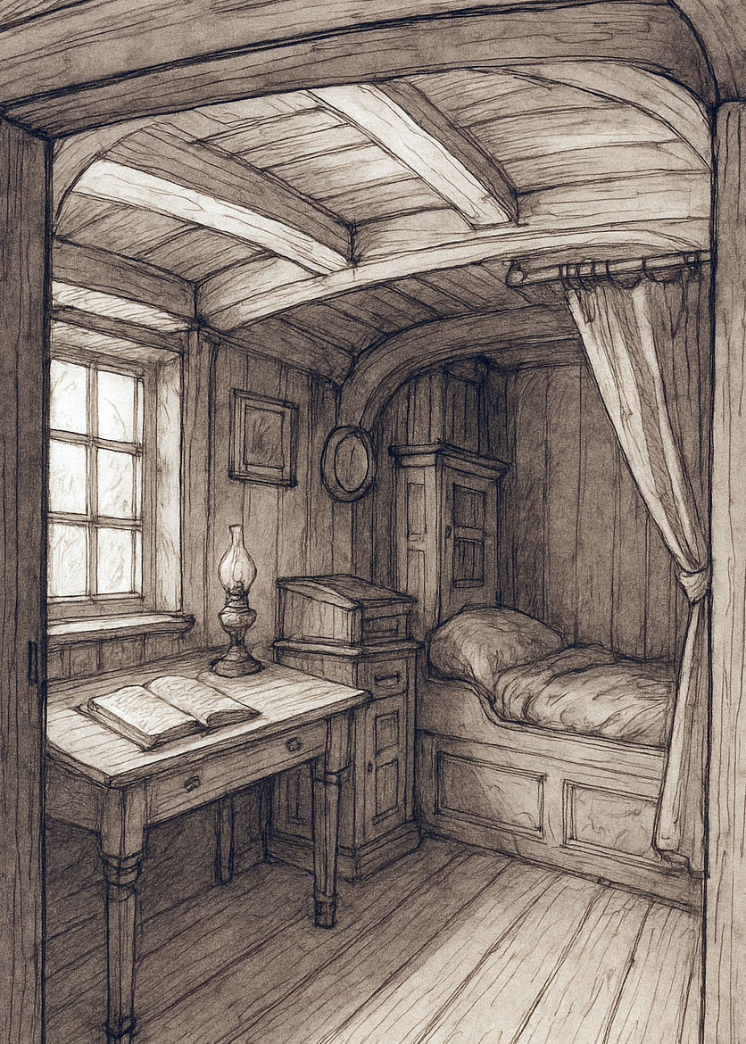 Captain’s cabin sepia Published June 20, 2025 at 836 × 1170 in Part One: outward bound Share this:Share Email a link to a friend (Opens in new window) Email Tweet Print (Opens in new window) Print