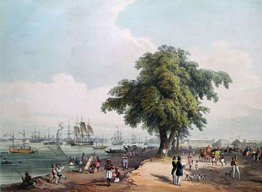 “Town and Port of Calcutta from Views of Calcutta and its Environs, produced by Sir Charles D’Oyly c1836-1845 but not published in London until 1848. D’Oyly puts himself in the painting with his sketch pad and he is dressed in the style of the 1830s.