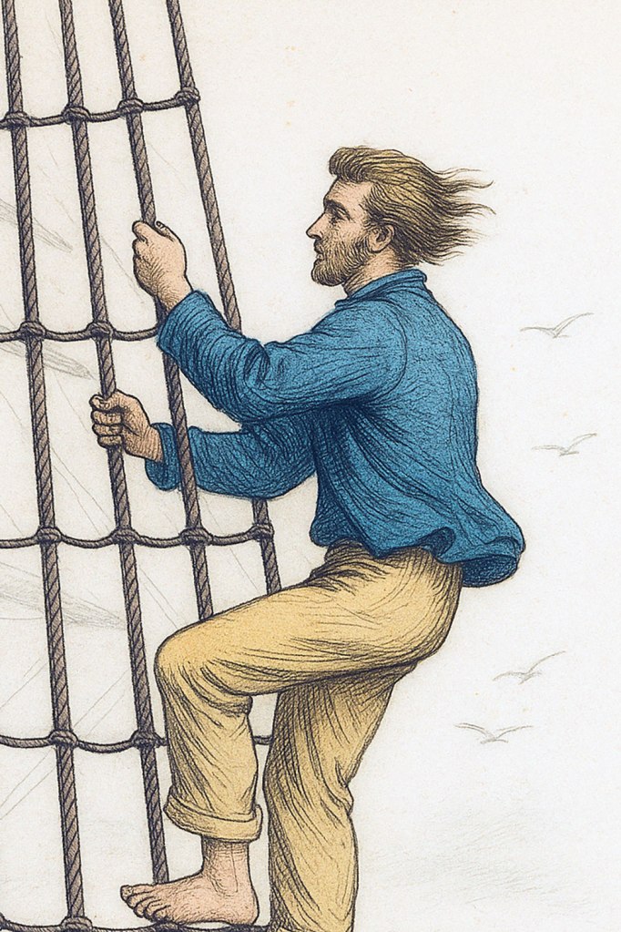 Sailor-climbing-rigging Published June 14, 2025 at 999 × 1499 in Part One: outward bound Sailor aloft Share this:Share Email a link to a friend (Opens in new window) Email Tweet Print (Opens in new window) Print