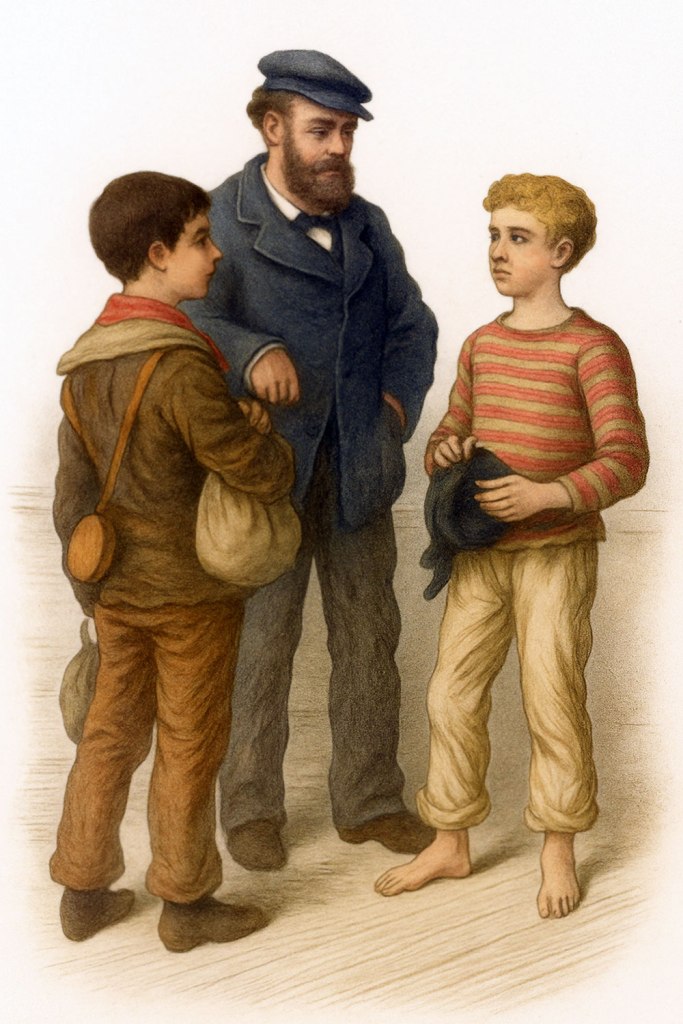 Two-ship’s-boys Published June 14, 2025 at 1000 × 1500 in Part One: outward bound Captain with two ship’s boys. Based on old engraving, source unknown. Share this:Share Email a link to a friend (Opens in new window) Email Tweet Print (Opens in new window) Print